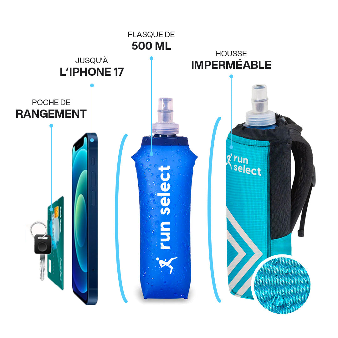 Notre produit propose une contenance de 500ml. Les coureurs cherchent souvent une gourde suffisamment légère mais avec assez de contenance pour ne pas les encombrer. Une capacité de 350 à 500 ml est recommandée pour des courses de courte à moyenne durée.